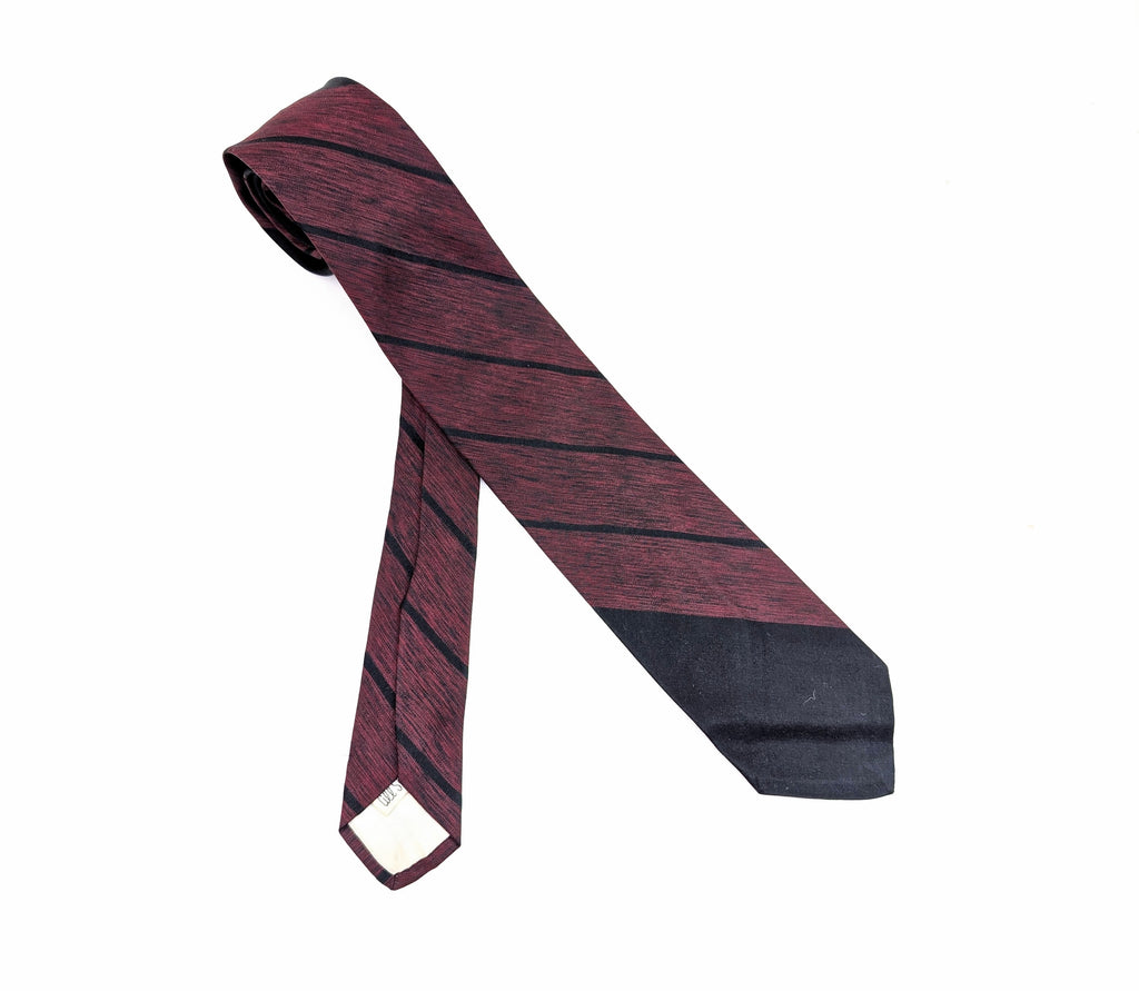 1950s Mad Men Era Men's Vintage All Silk Skinny Red & Black Necktie by Woolf Brothers. A beautiful shiny sharkskin type tie of all silk material with diagonal woven bands of red on a black background. The tie is fully lined in a white silk material and retains its original embroidered label from Woolf Brothers as well as a secondary label reading "All Silk". A Striking Mid Century Modern necktie in great shape!