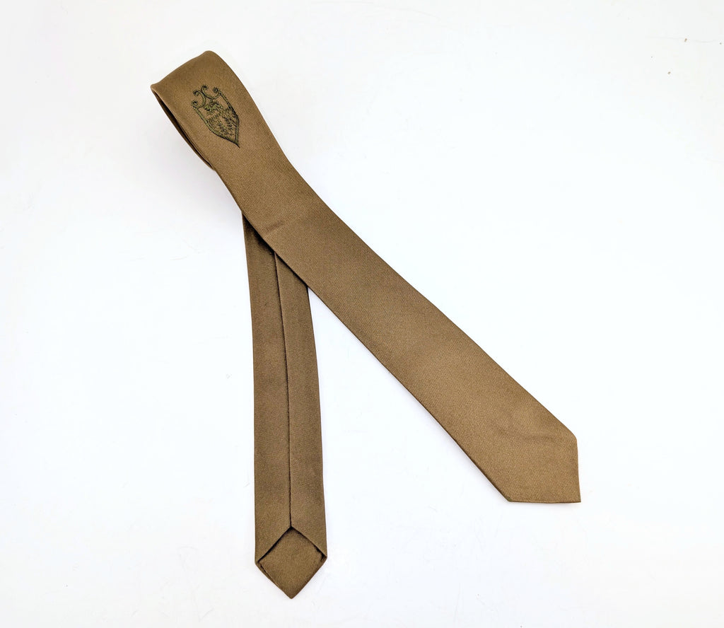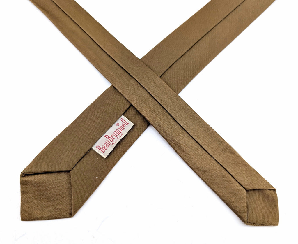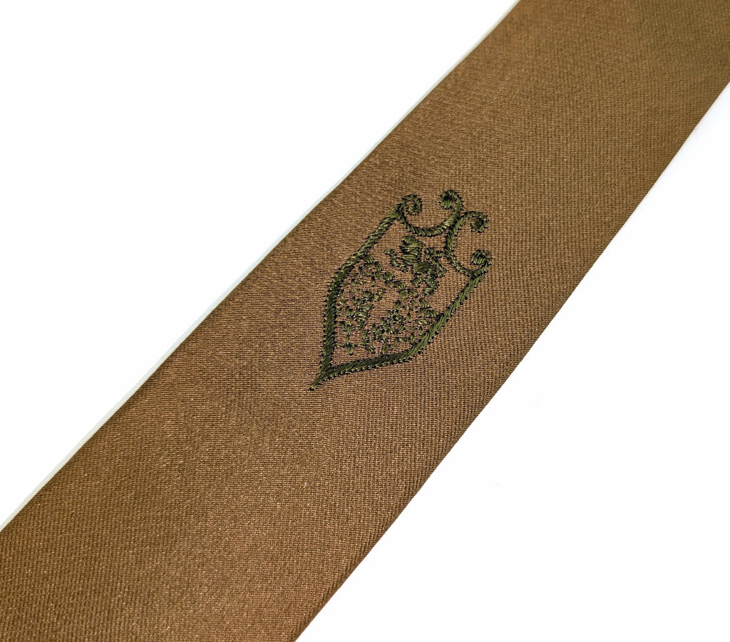 Vintage Super Skinny Narrow 1960s Men's Shiny Golden Brown All Silk Necktie with embroidered shield and lion design in green thread by Beau Brummell. Looks fantastic with Mad Men Era 60s Sharkskin suits! Nice texture and sheen to Silk Fabric. Original label reads "Beau Brummell ALL SILK". A great tie in great shape!