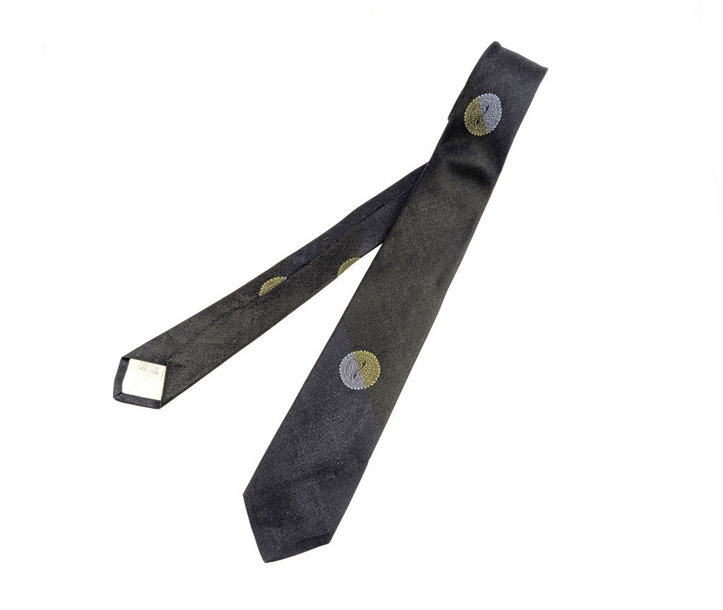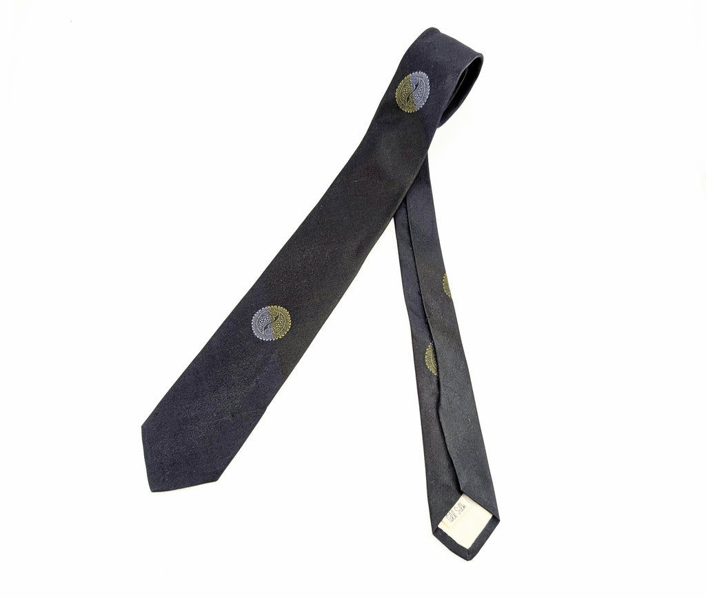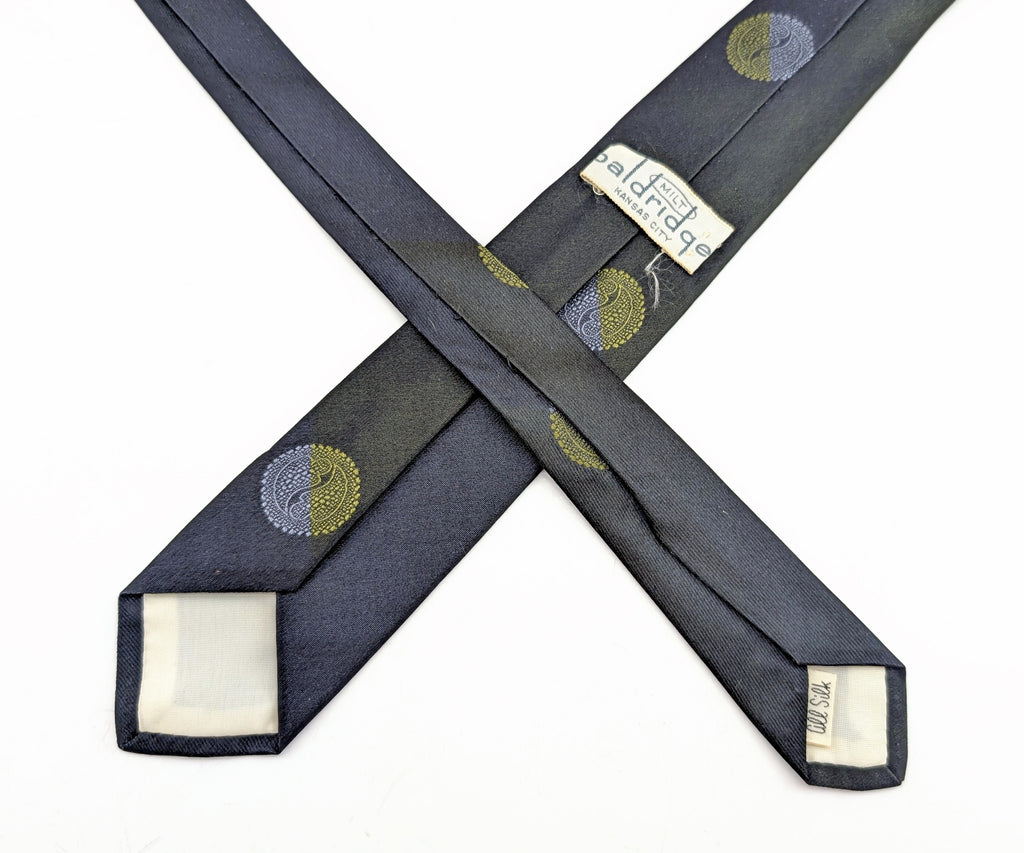 Vintage Super Skinny Narrow 1960s Men's Shiny Dark Navy Blue All Silk Necktie with woven Asian style Paisley Medallions. The fabric has faint woven diagonal bands of yellow silk thread throughout the dark navy blue (almost black) body. Looks fantastic with Mad Men Era 60s Sharkskin suits! Nice texture and sheen! Original keeper loop label reads "MILT baldridge KANSAS CITY". In addition, there is a secondary label reading "All Silk". A great tie in great shape!