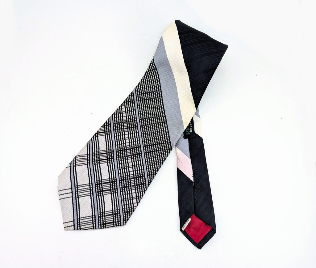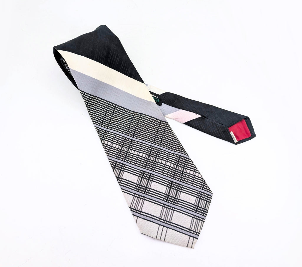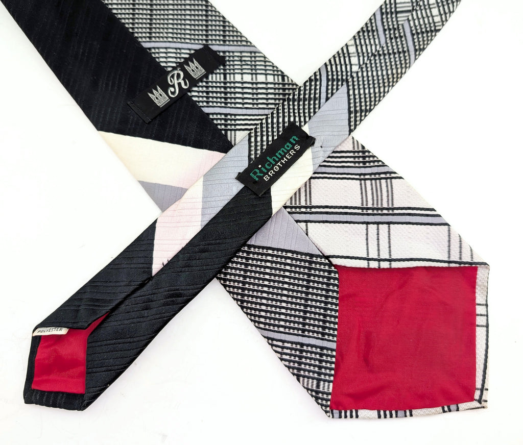 Super Groovy, Super Wide 1970s Vintage Men's Disco Era Polyester Necktie by Richman Brothers. The tie is made of a black, white and gray fabric with diagonal bands and stripes. The tie is fully lined with shiny red nylon taffeta fabric. The tie retains its original embroidered label reading "Richman Brothers". An Awesome Disco Era Men's Tie!