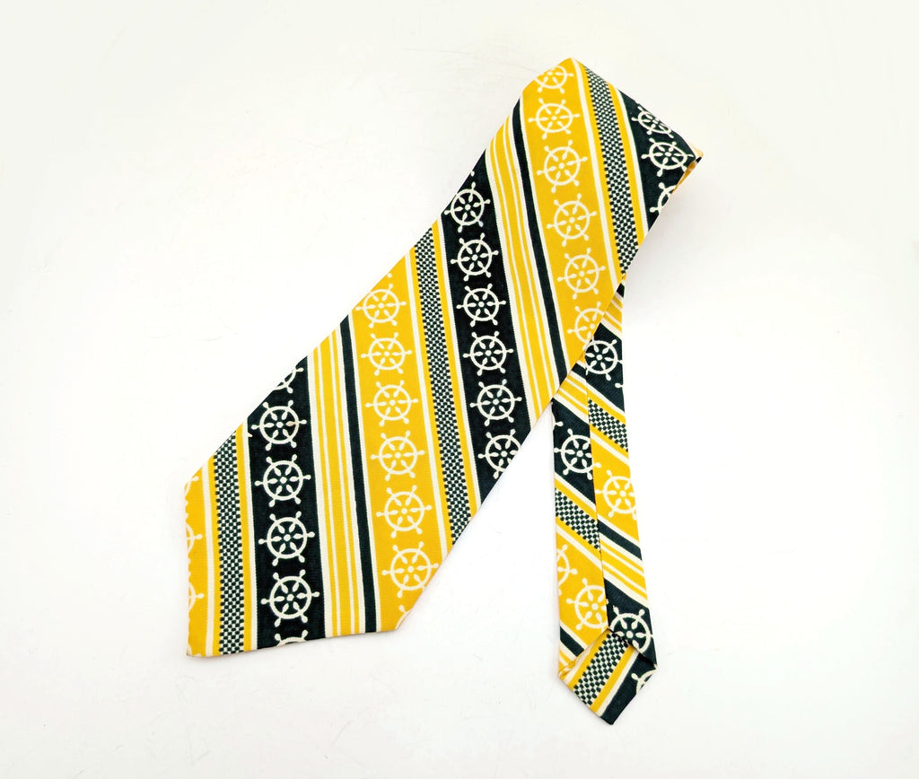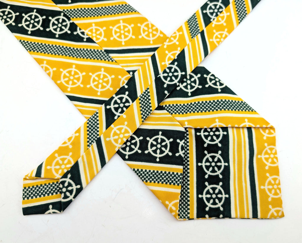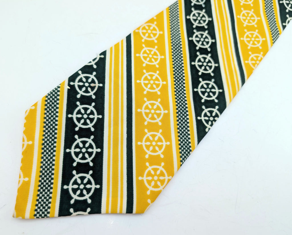 Super Groovy, Super Wide 1970s Vintage Men's Disco Era Polyester Necktie. The tie features Diagonal Bands and Stripes in Yellow, Green and White with White Ship's Wheels designs on the green and yellow bands. The tie is unlined and unlabeled, still a Groovy Super Wide (4-3/4") Disco era men's tie!